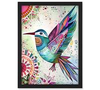 Artery8 Hummingbird With Multicolour Mandala Patterns Folk Art Watercolour Painting Artwork Framed A3 Wall Art Print