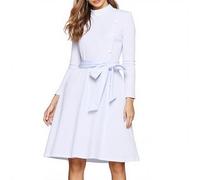 FAD-4U Church Clergy Dress for Women Spring/Autumn Long Sleeve Rows Buttons A Line Dress with Tab Collar and Belt White