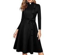 FAD-4U Church Clergy Dress for Women Spring/Autumn Long Sleeve Rows Buttons A Line Dress with Tab Collar and Belt Black