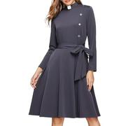 FAD-4U Church Clergy Dress for Women Spring/Autumn Long Sleeve Rows Buttons A Line Dress with Tab Collar and Belt Grey