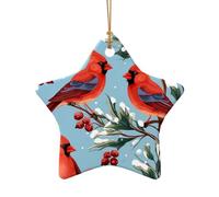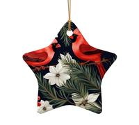 Christmas Red Bird Floral Ceramic Christmas Tree Ornament, Double-Sided Printed Star Shape Porcelain Hanging Decoration, Elegant Holiday Keepsake for Xmas Tree Home Office Gift Exchange