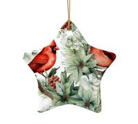 Christmas Winter Red Bird Floral Ceramic Christmas Tree Ornament, Double-Sided Printed Star Shape Porcelain Hanging Decoration, Elegant Holiday Keepsake for Xmas Tree Home Office Gift Exchange