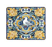 Vintage Floral Square Desk Mouse Pad, Blue Yellow Ceramic Bird Design Stitched Edge Mousepad, Rubber Non-Slip Washable Gaming Mouse Pad for Home and Office Computer, Laptop Square 8x10 Inch