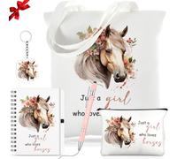 Kinlop 5 Pcs Horse Gifts for Women Include Just a Girl Who Loves Horses Tote Bag Canvas Cosmetic Bag Coil Notebook Keychain and Ballpoint Pen for Women Girls, Pink, Horse