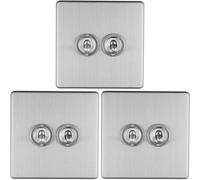 3 PACK 2 Gang Double Metal Light Switch SATIN STEEL 2 Way 10A Grey Trim
