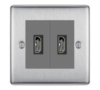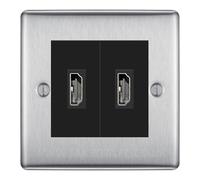 BG Nexus Brushed Steel 2 Gang HDMI Socket Black Inserts